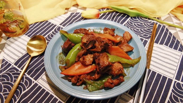 24. 鸡精6g左右,然后翻炒均匀。让肉和尖椒上色入味。就可以乘盘上菜了!