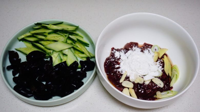 3. 将葱姜蒜和淀粉料酒放入到切好的猪肝中