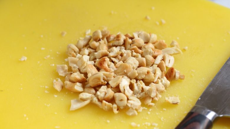 腰果仁炝芹菜,捞出沥去多余油后用刀背拍碎待用。