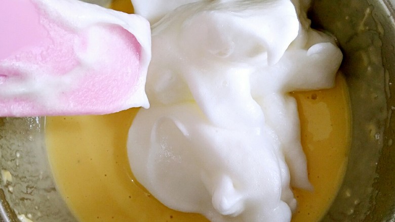 10. 将上面步骤中搅拌均匀的粉糊再倒入剩下的三分之二的打发蛋白中。