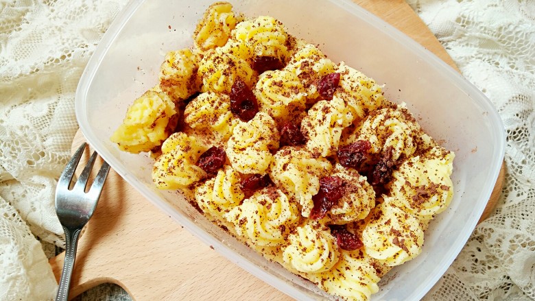 23. 在挤好豆乳馅的蛋糕上面可以根据个人喜好加蔓越莓或其他水果坚果等。