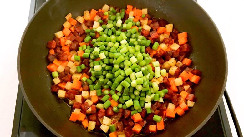 11. 加入腊肠,翻炒1分钟