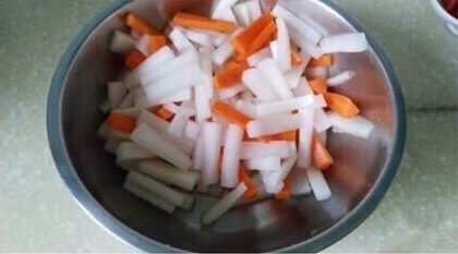 6. 将沥干的白萝卜、胡萝卜条放入玻璃保鲜盒中(玻璃瓶也可以)(一定要密封的)加入生姜片、红辣椒。加入糖醋水没过萝卜条