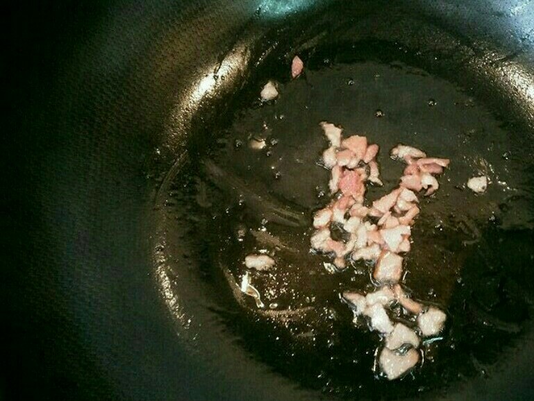 3. 热锅内加少量油将培根切成小片放入锅中抄一下。
