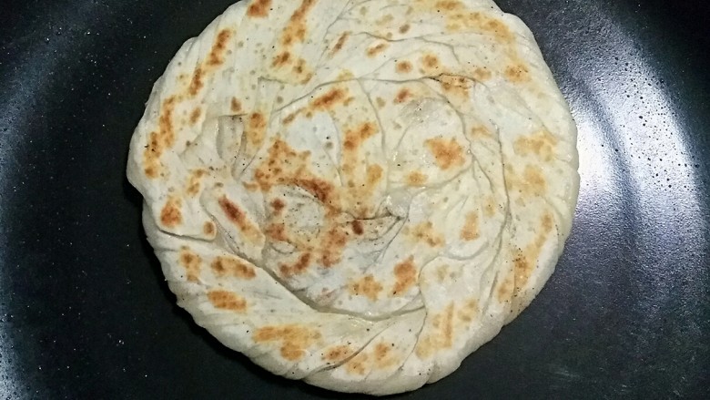 11. 待饼一面烙金黄后,翻面烙另一面,两面都金黄焦脆时出锅。