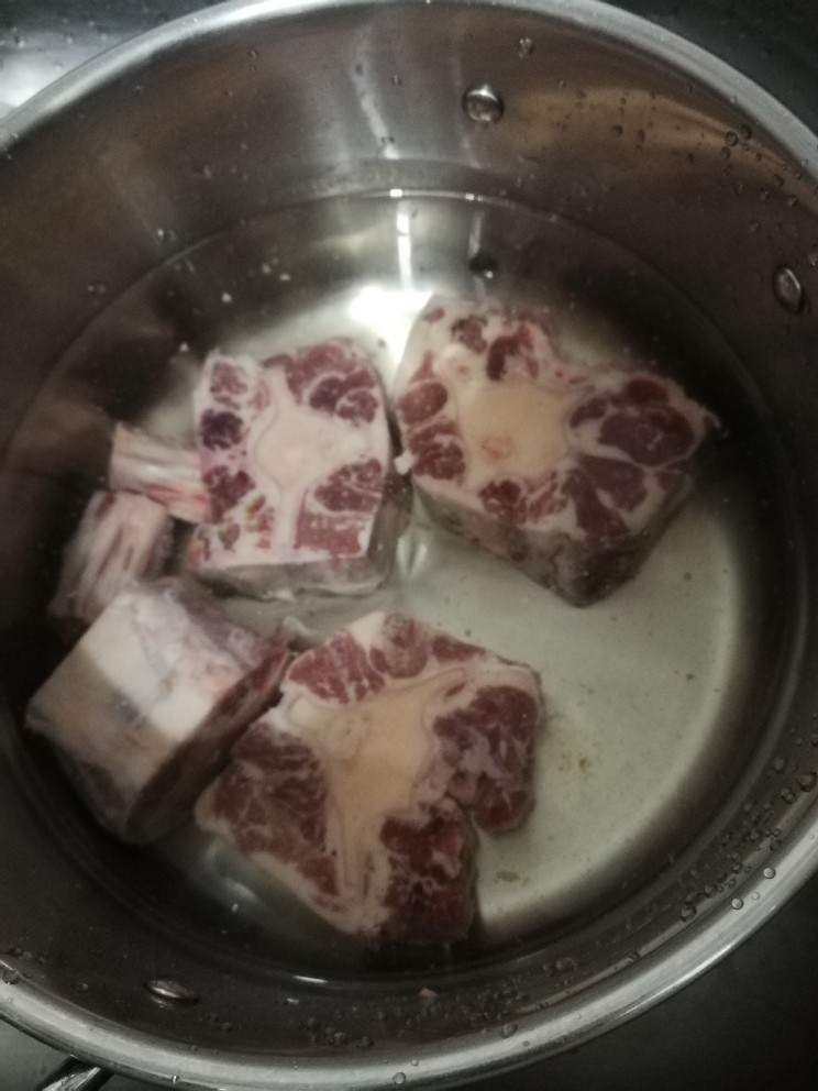 13. 红酒加好,再加入适量热水没过牛尾块。然后大火烧开,撇去浮沫,小火炖大概一个半小时。