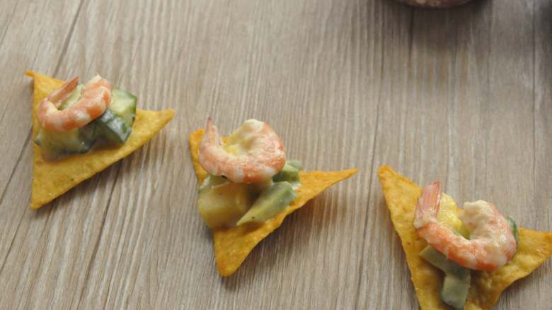 8. 取一片玉米片,用勺子舀上适量的沙拉。