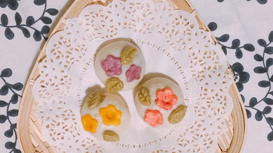 7. 擀一块绿色面团 用食品剪子剪出叶子🍃形状 用牙签压出叶脉 用一点水粘在豆包上