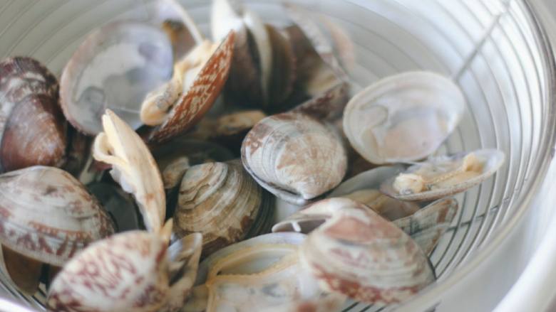 1. 花蛤放清水中,放少许盐和香油,浸泡2小时以上,吐净泥沙。