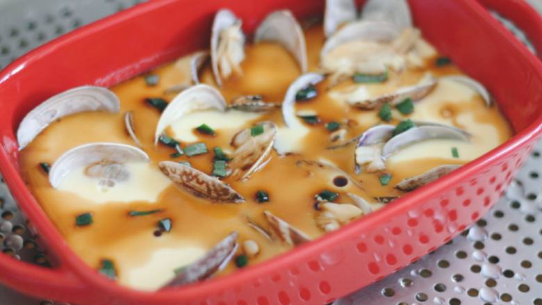 8. 摆入花蛤,蛋液不要完全没过花蛤。