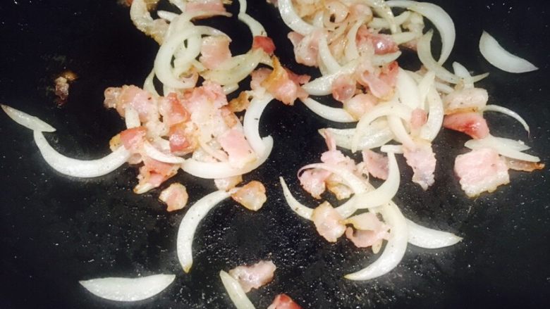 6. 等到培根表面略微上色,放入洋葱炒香。