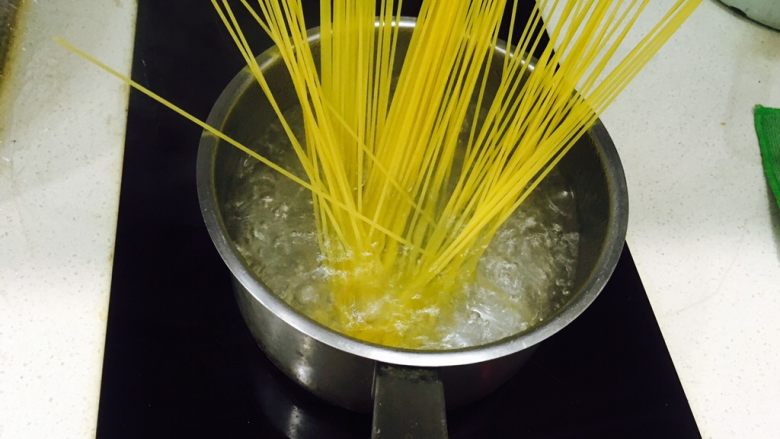 3. 准备一锅水,煮沸,加入少许盐,将意面均匀放入。