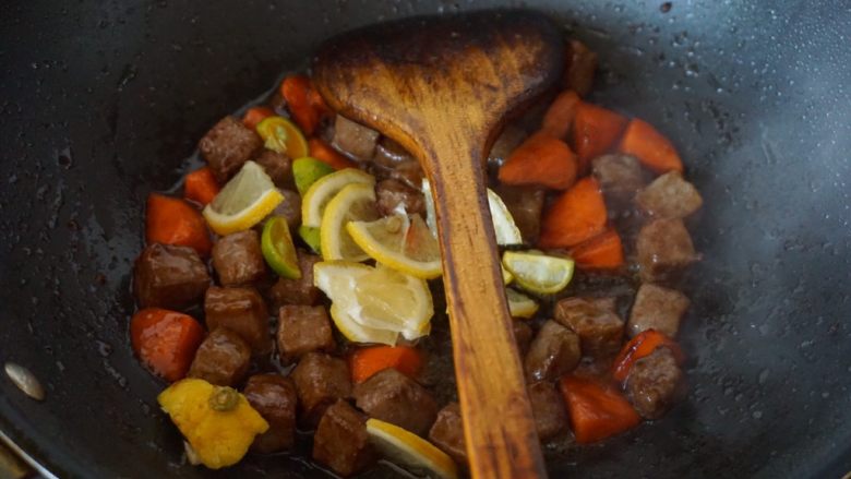 8. 再加入柠檬片和青桔翻炒