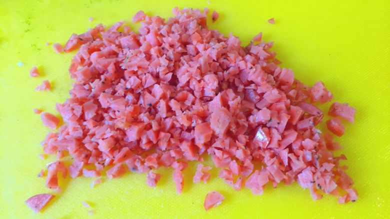 4. 然后找个大碗,把韭菜沫,香肠沫和鸡蛋放在一起。