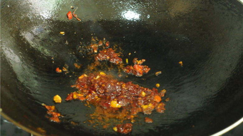 9. 放入一勺烤肉酱炒出红油,提味增色
