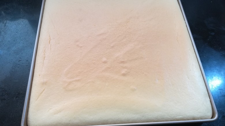 16. 烘烤结束后,端起烤盘,在台面上轻震几次。震出内部的热气。根据要卷的方式,置于晾架上晾至微温,想要正确的话就正面朝上,反卷就地面朝上晾凉,有微微的温度就可以卷了,不要等到完全晾凉后再卷,那样容易裂开。