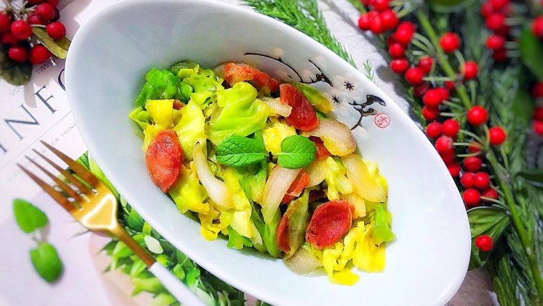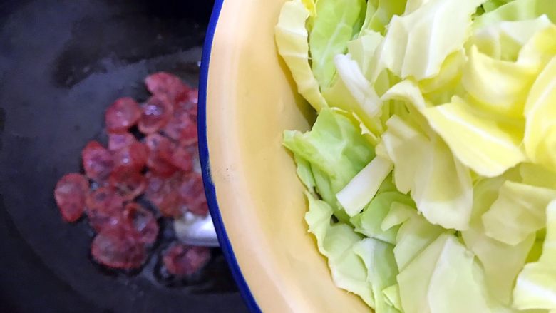 2. 腊肠稍微冲洗一下之后斜45°切成薄片,备用