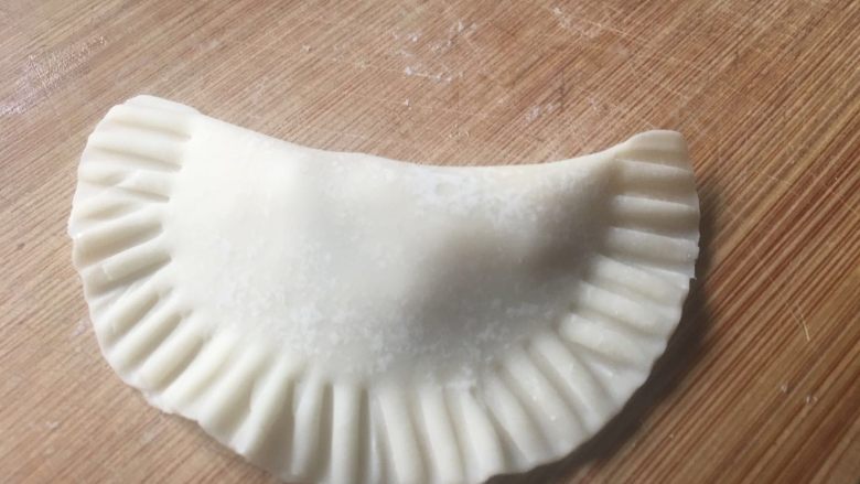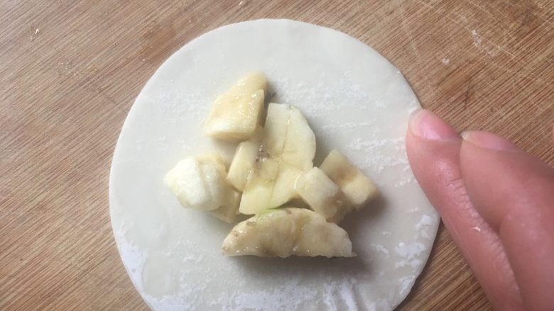 11. 另取一个饺子皮,放入香蕉,折叠(不要放太多香蕉免得合不上,或者撑破饺子皮);