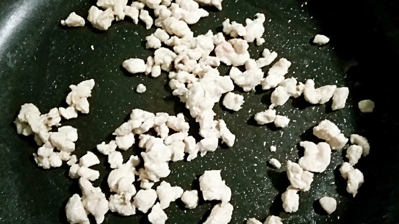 16. 将2勺豆瓣酱用适量的温水稀释一下,倒入锅中和肉丁,葱花一起翻炒均匀。