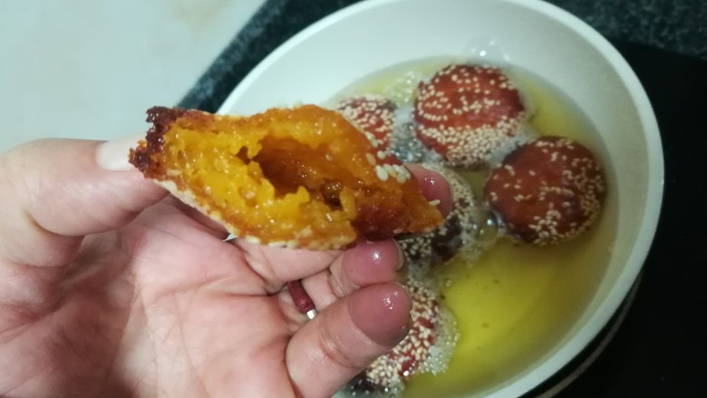 20. 成品图。 外皮有点酥,里面有点空,吃起来香喷喷,又非常有嚼劲的南瓜麻饼就做好了。