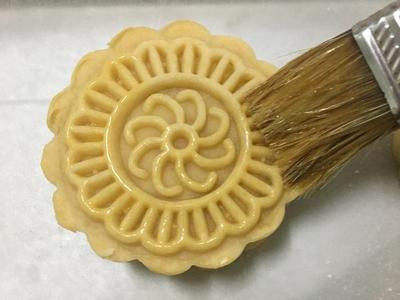 13. 15分钟取出,月饼表面均匀的刷上蛋黄液(刷怪蛋黄液是为了月饼表面上色更漂亮)