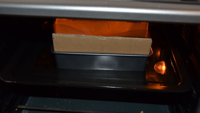 21. 把模具放进烤盘,然后再倒水进烤盘中~ 再放进预热好的烤箱,如果你的烤箱温度不偏高,那么150度上下火烤60分钟就OK了。 我用的是长帝,温度稍高,所以上火130度,下火140度烤60分钟。
