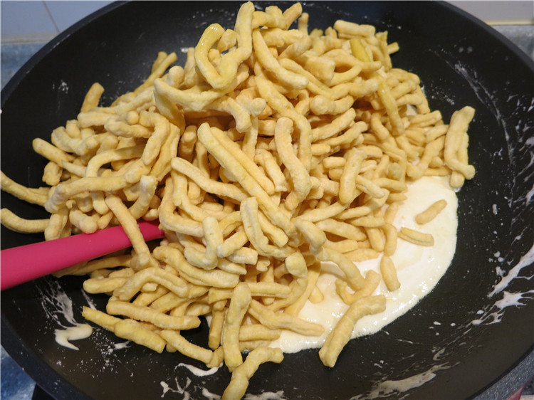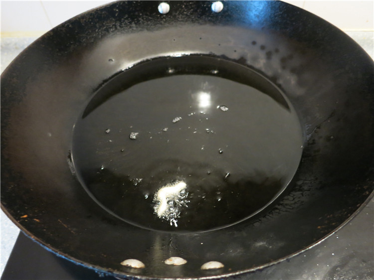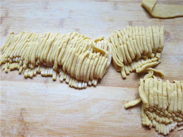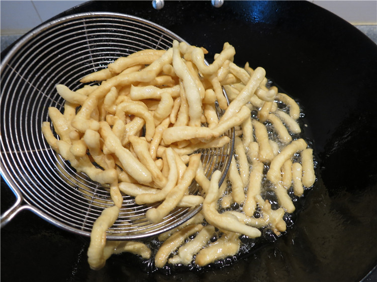 13. 炒锅放入适量的植物油,烧热后用一小块面条试下油温,放入立即浮起说明油温合适可以炸了