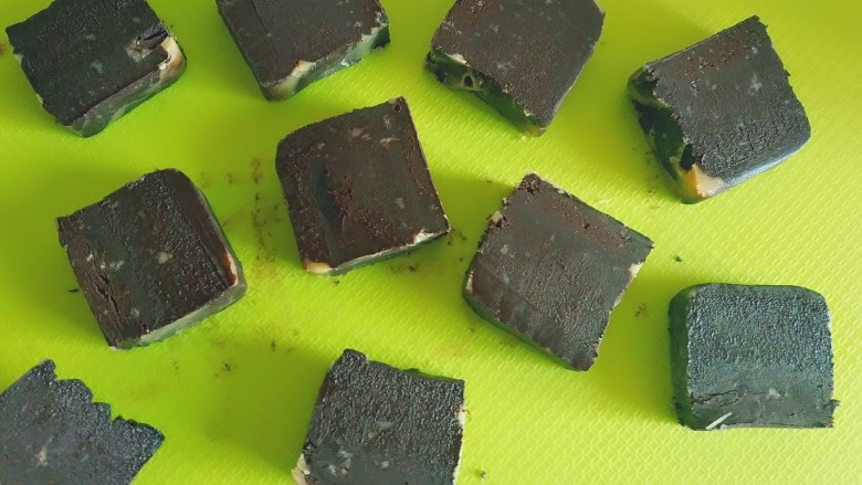 10. 切块。切的时候要加热刀具,以免生巧会粘。表面不平整。
