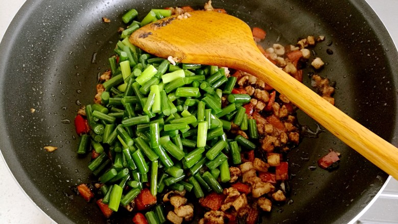 18. 炒至十分熟(蒜苔表面微皱)即可关火。