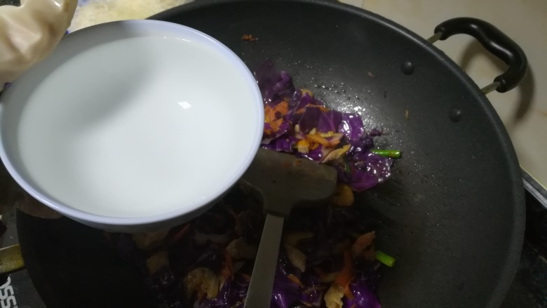 12. 加入紫甘蓝煸炒。