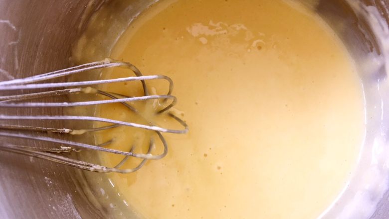 2. 电动打蛋器打至砂糖融化,蛋黄液颜色变浅,液体呈浓稠状态