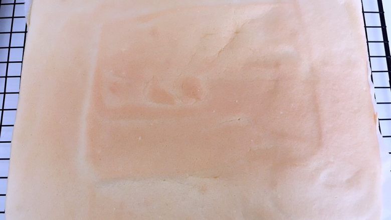 5. 入烤箱200度烤5分钟,之后转170度烤2分钟,出炉另铺一张油纸,将烤好的虎皮面倒扣在新油纸上,之后撕掉表层油纸