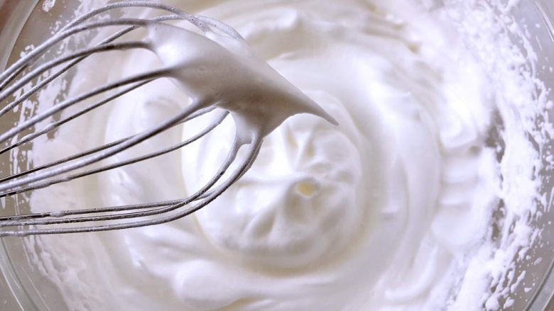 10. 蛋白加几滴柠檬汁,分三次加入剩下的砂糖,打发至湿性偏干一点的发泡,打蛋器提起有个小弯钩即可