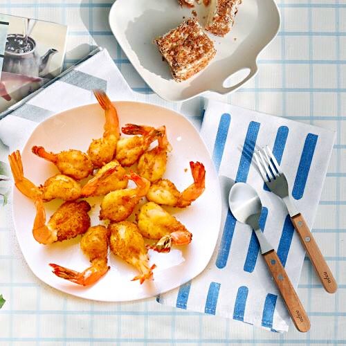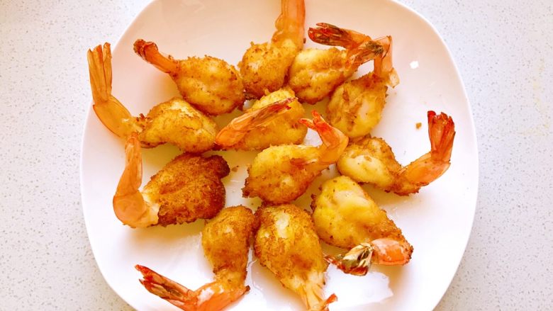 12. 香酥鲜嫩的黄金虾炸好啦,可以沾着番茄酱吃也可以什么都不粘。