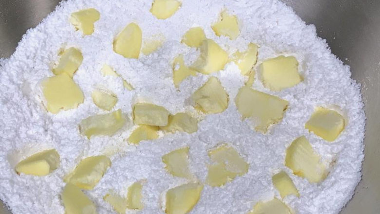 4. 用切拌器或刮板,不断地将奶油切开,跟面粉结合成小粒状。此步骤也可以直接用手,将黄油块跟面粉一起揉碎,但要注意别让手温将黄油融化开,这样会影响到成品的口感。