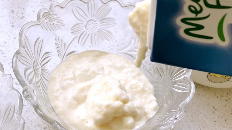1. 准备1升装的常温全脂纯牛奶和1小袋常温酸奶发酵菌粉,把菌粉倒进牛奶里摇匀;