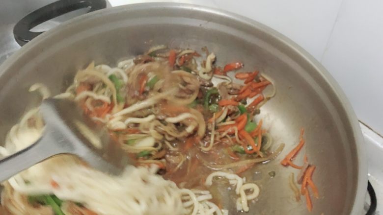 5. 豆芽炒至半熟后放入尖椒和圆葱丝炒至香味溢出