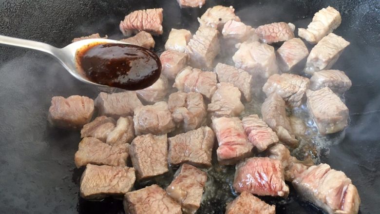 11. 倒入煎炒好的黑胡椒牛肉粒。