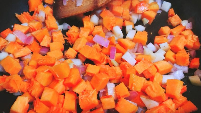 4. 洋葱煸炒至透明软化,加入土豆丁