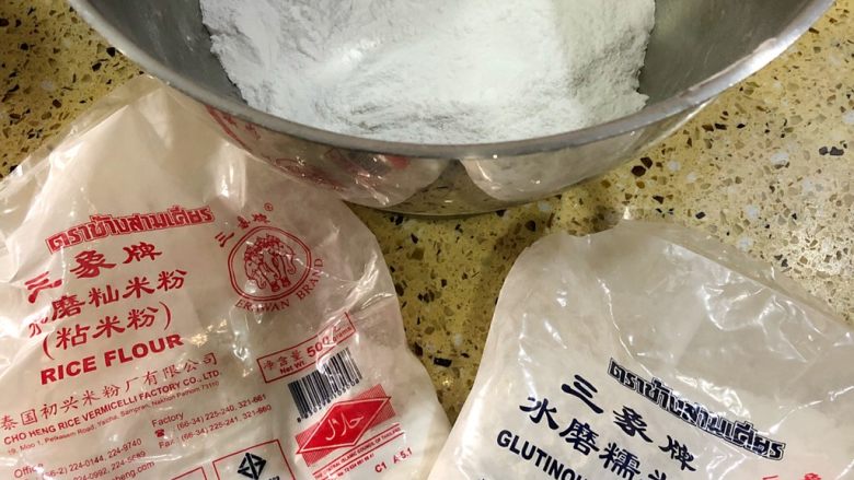 9. 白色松糕的材料 热水加糖加猪油搅拌至糖油融化 再分几次加入粉中 用筷子搅拌 最后用手把粉搓均匀