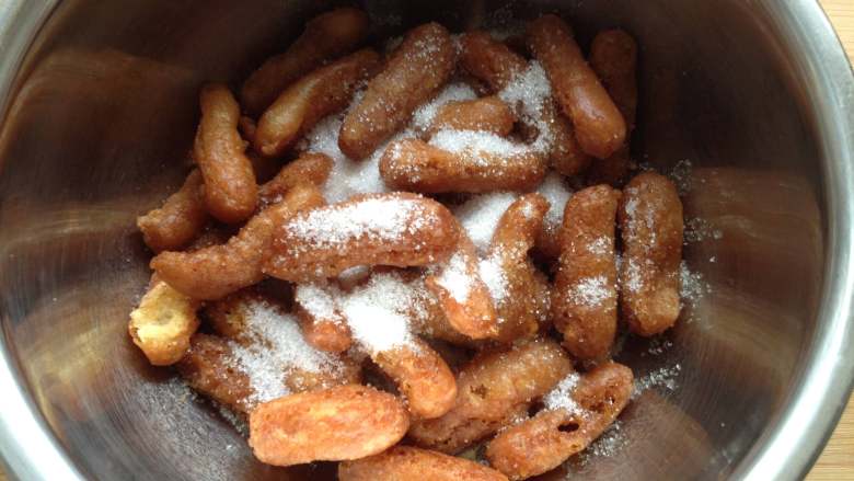 - 4、江米条炸好后也可以裹糖浆,我嫌麻烦就没做这一步,直接裹白糖了