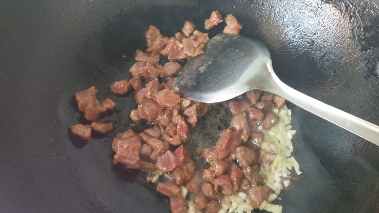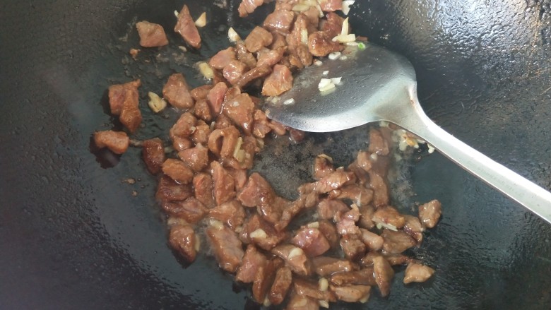 11. 放生姜,大蒜爆香,放牛肉丁翻炒。