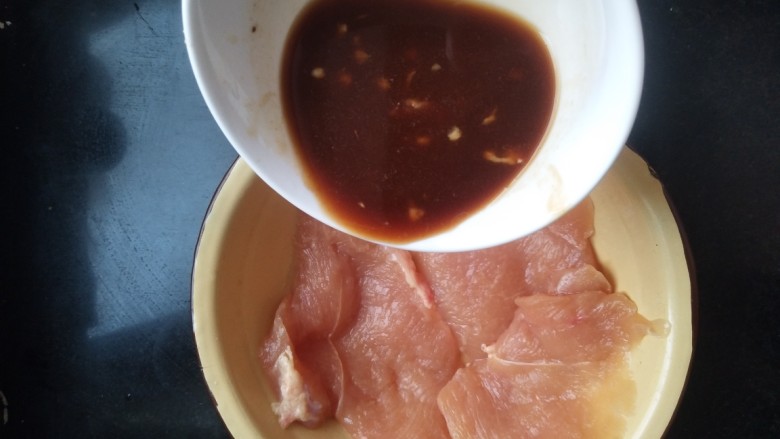 10. 腌制好的鸡胸肉,放入平底盘中。