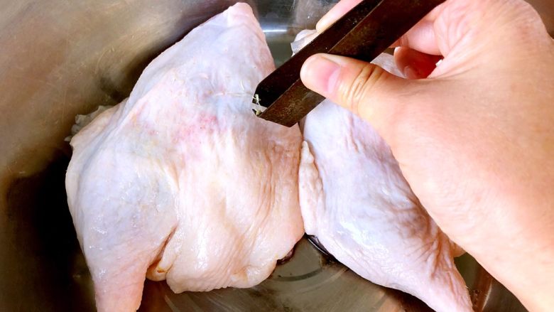 4. 泡好以后用夹子夹干净鸭腿上的细毛