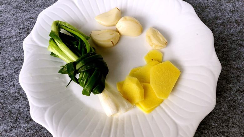 12. 把蒜去皮拍扁,生姜洗净去皮切片,葱洗干净打成葱结(煮鸭腿时候再准备这些)