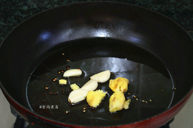 4. 热锅倒油,下蒜瓣和姜片爆香