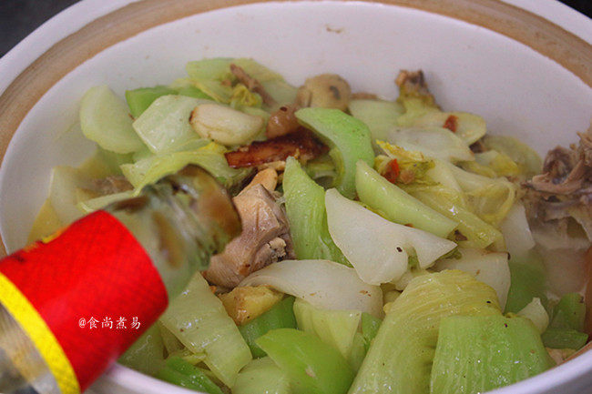 - 鸡肉本身是熟的,在锅中不用煮太久。冬天的包心芥菜煮起来很快就软化,盛入砂锅中,煮开就可以端上餐桌食用了。