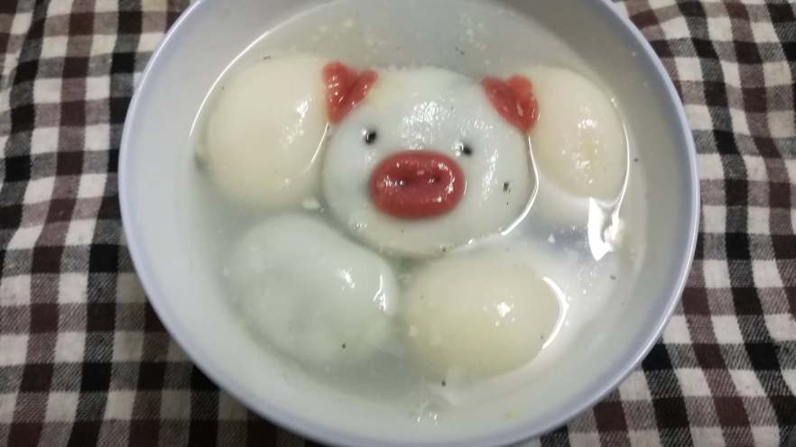 19. 这是用红曲粉做成的小猪造型,眼睛是黑芝麻,粘合的部位沾水即可