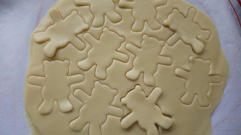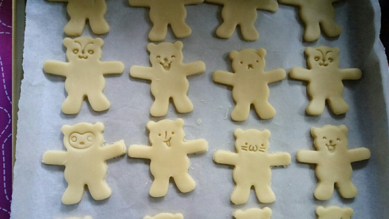 13. 把油纸连同饼干一起放入烤盘,烤箱预热175度,放入中层,上下火烤15分钟。注意观察,不要上色过度。烤好后取出来晾晾就可以开吃了!是不是萌萌哒?😊