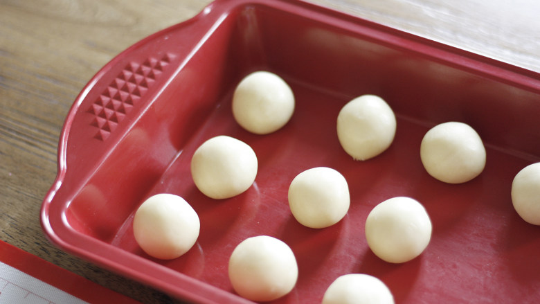 8. 将面团分成20个均匀大小的小面团,并揉成球形放置备用,在分揉的过程中,已经做好的小面团要覆盖保鲜膜哦